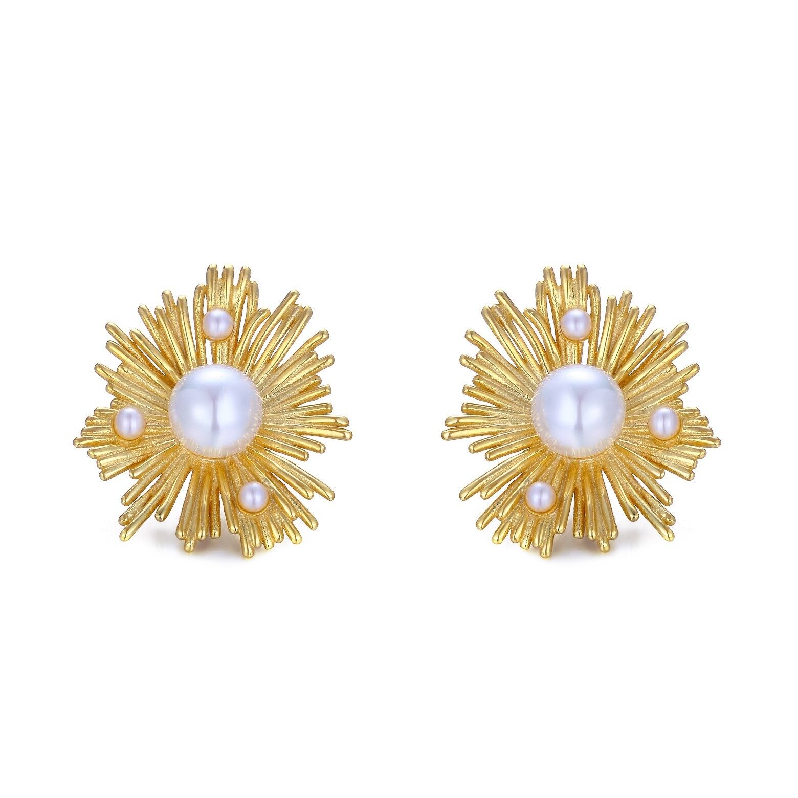 黄金のサンフラワーモチーフにちりばめられたパールがおしゃれな、花ピアス。シルバーの象る、ひまわりの花弁の繊細なディティールが美しく、シンプルなスタイルのファッションも、より女性らしく華やかな印象をプラスしてくれるアイテム。