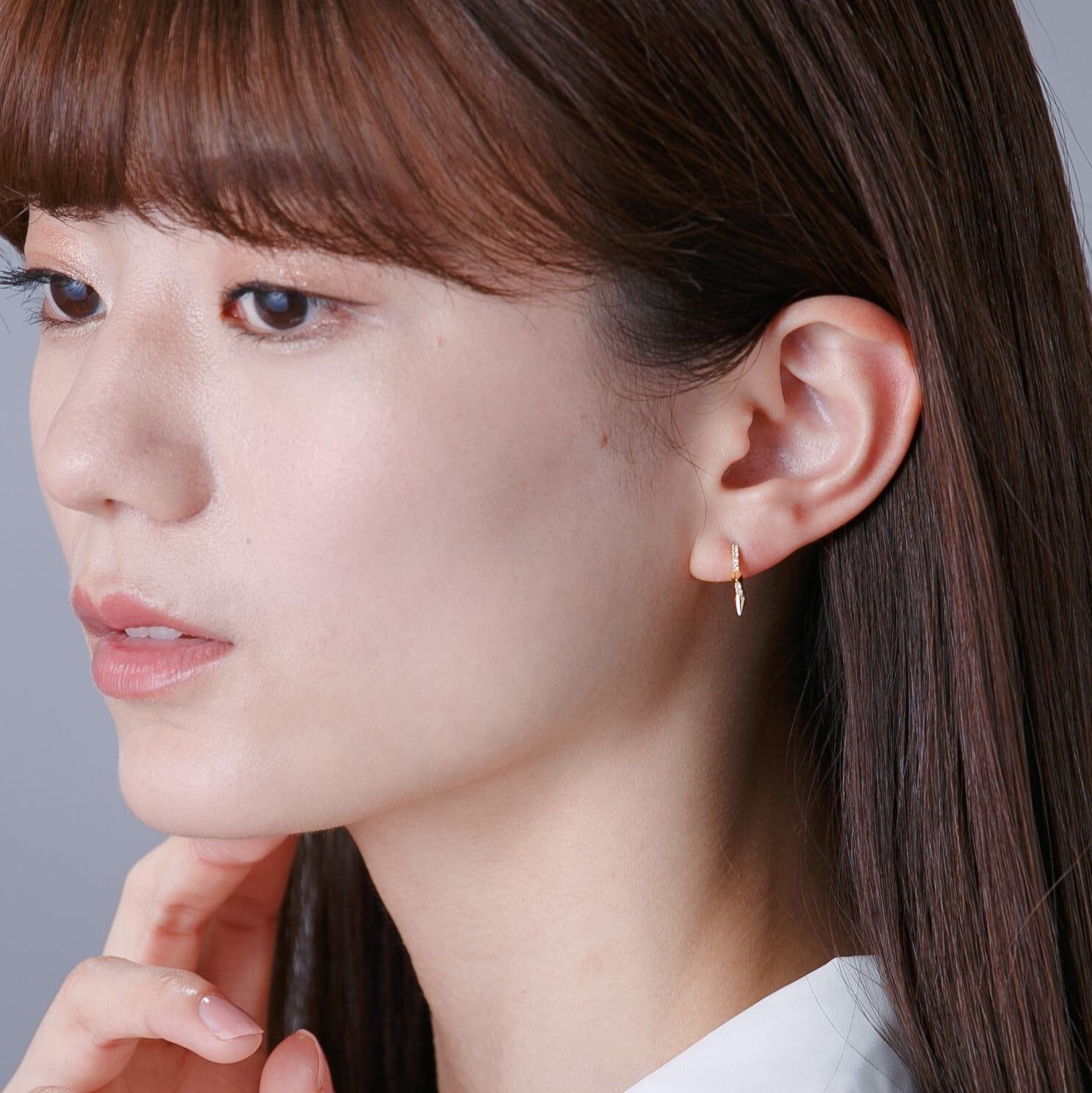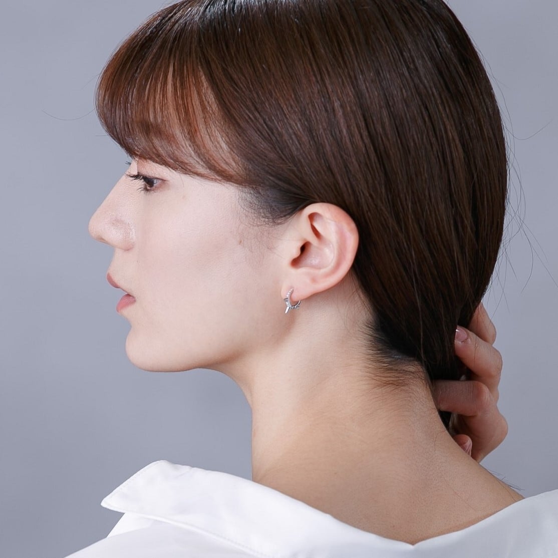 片耳着用でもおしゃれなモチーフ。甘系ファッションに、ちょっとしたスパイス感覚で着用できるサイズ感もポイント。フープはやや細身で、異なるフープやイヤーカフと合わせてレイヤードにアレンジするのも◎