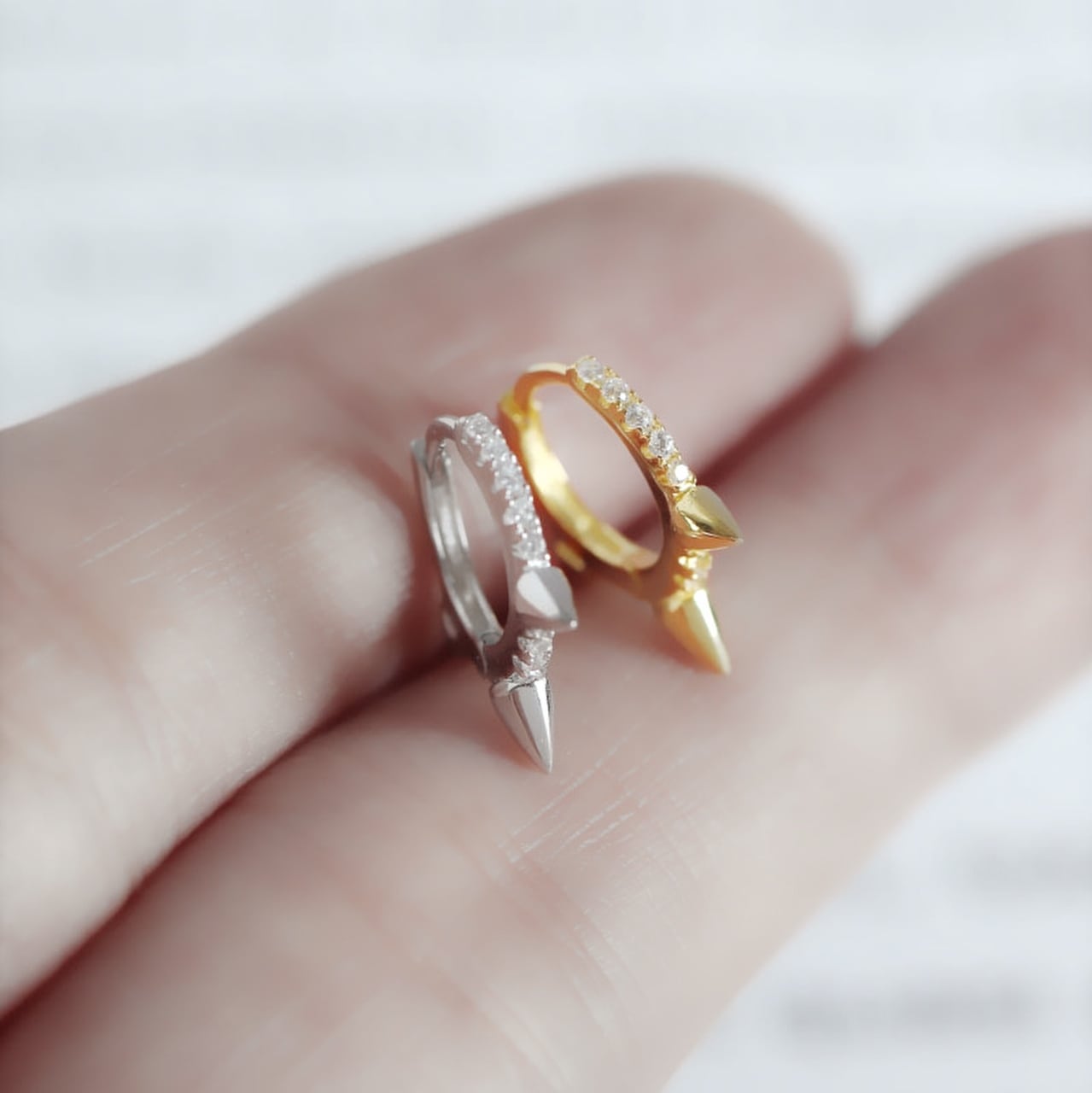 スパイクときらきらのキュービックジルコニアが一体になった甘辛テイストのミニフープピアス。メタリックの小さな尖がりがクール&可愛いジュエリー。